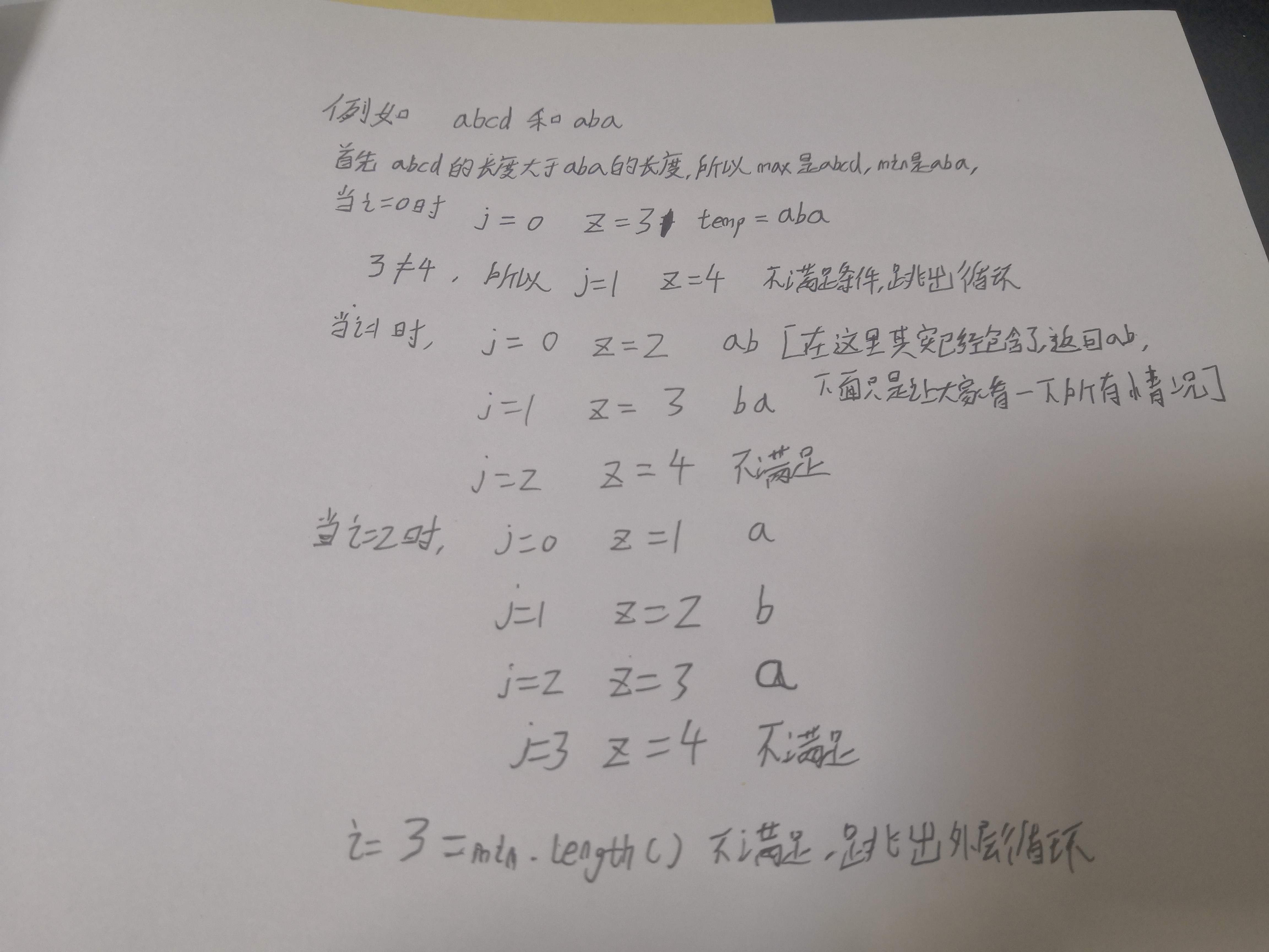for(int i=0;i<min.length();i++){ //遍历短串的各种情况