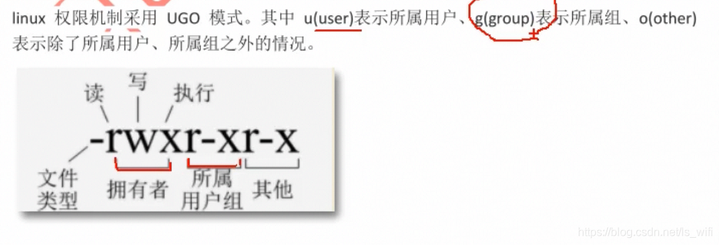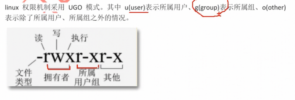linux权限机制采用UGO模式. 第一列的第一个字母 -表示文件 d表示目录 后边9位是权限