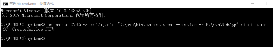 sc create 服务名称 binpath=空格"svnserve.exe --service -r E:/svn/WebApp" start=空格auto