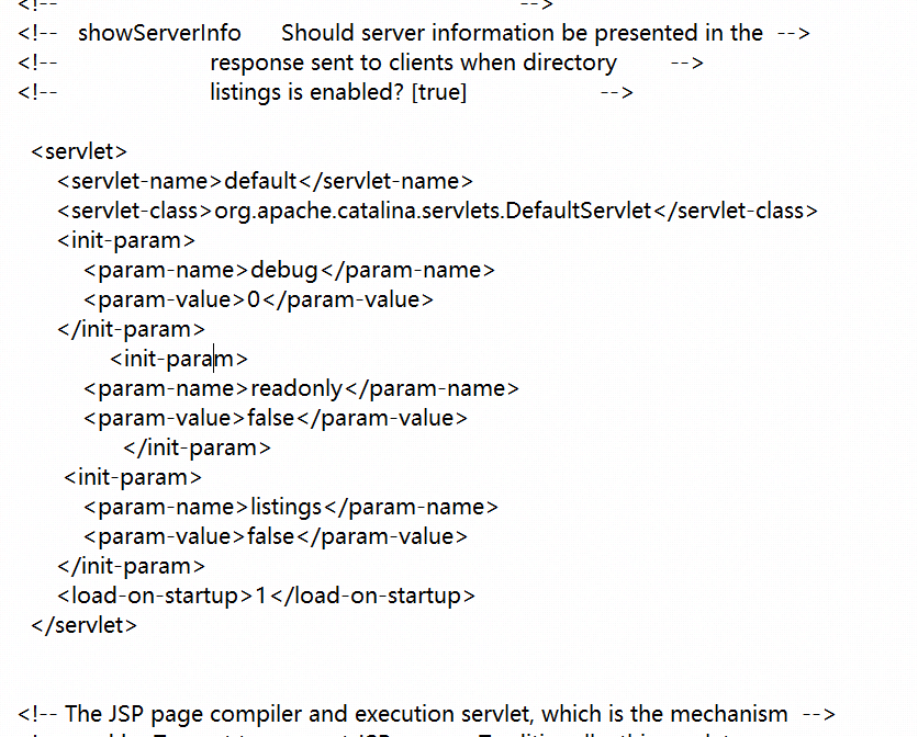 在学这儿的时候我遇到了很多bug哈哈,真烦,如果你遇到404错误的话,可能是你的服务器URL没配好,或者文件解析器没配,最后文件会发布在target目录中你所指定的那个文件,前提是你是war exploded方式部署的服务器,如果是war部署的话,可能会上传到tomcat目录下的webapps中去,如果遇到500错误显示的话,有两种可能,第一种有可能就是再做跨服务器上传时,tomcat禁止上传,这是需要在tomcat目录下的conf下的web.xml中进行设置,加上初始化参数readonly为false,这样就不会成只读了,就会允许跨服务器上传文件了,如下图所示,第二种就是你上传的文件是中文,也会报错,然后你加如下代码就可以了