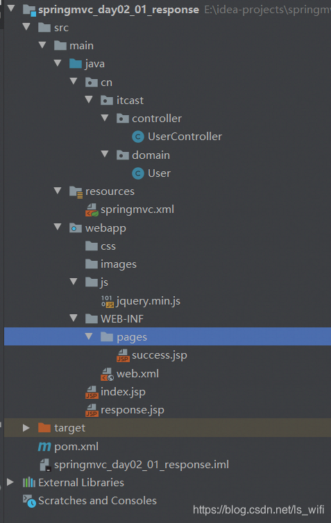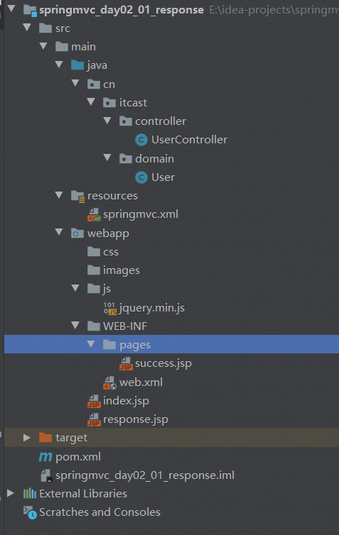 这7个知识点分布在UserController类、User类、success.jsp、response.jsp、springmvc.xml中