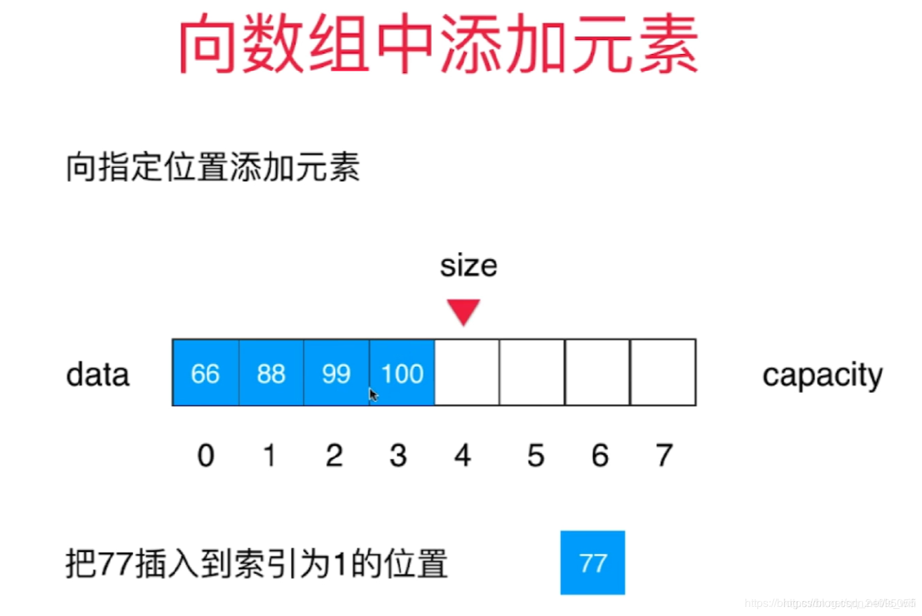 总结:首先,size指向的是数组的第一个位置,也就是索引为0的地方,先说向所有元素后添加一个元素,按照addLast()方法,如果size的长度等于数组的长度,则满了,不能再添加了,抛出个异常,反之,如上图size指向了索引为4这个位置,则data[4]=e,size继续指向5那个位置.