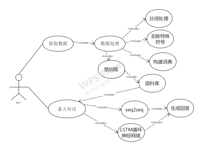 本工程实践需抽取的用例:获取数据、录入对话、数据处理、预训练、分词处理、去除特殊符号、构建词典、语料库、seq2seq、LSTM循环神经网络、生成回答。