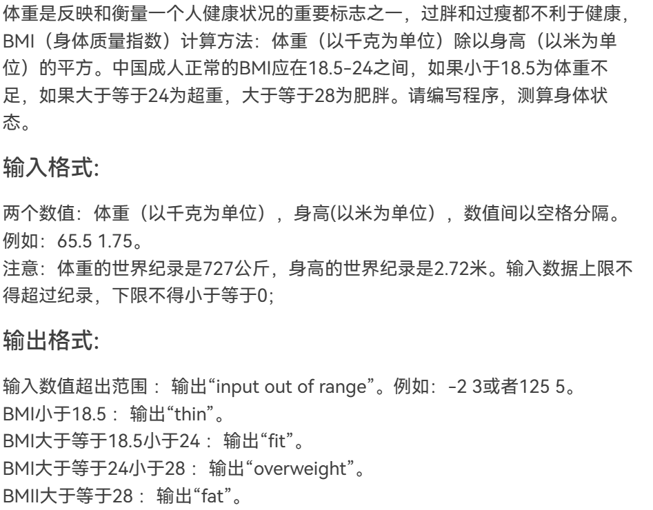 本题输入身高体重,计算出身体的BMI值,并运用 if 判断语句对不同范围的BMI值进行区分,分为thin,fit,overweight,fat四个状态,对于超出范围的数值输出input out of range。