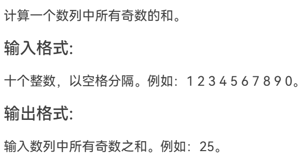 本题运用了for循环语句与if判断语句,依次输入10个整数,对每个整数做是否为奇数的判断,i除以2的余数不为0时i为奇数,将i与sum相加求和。