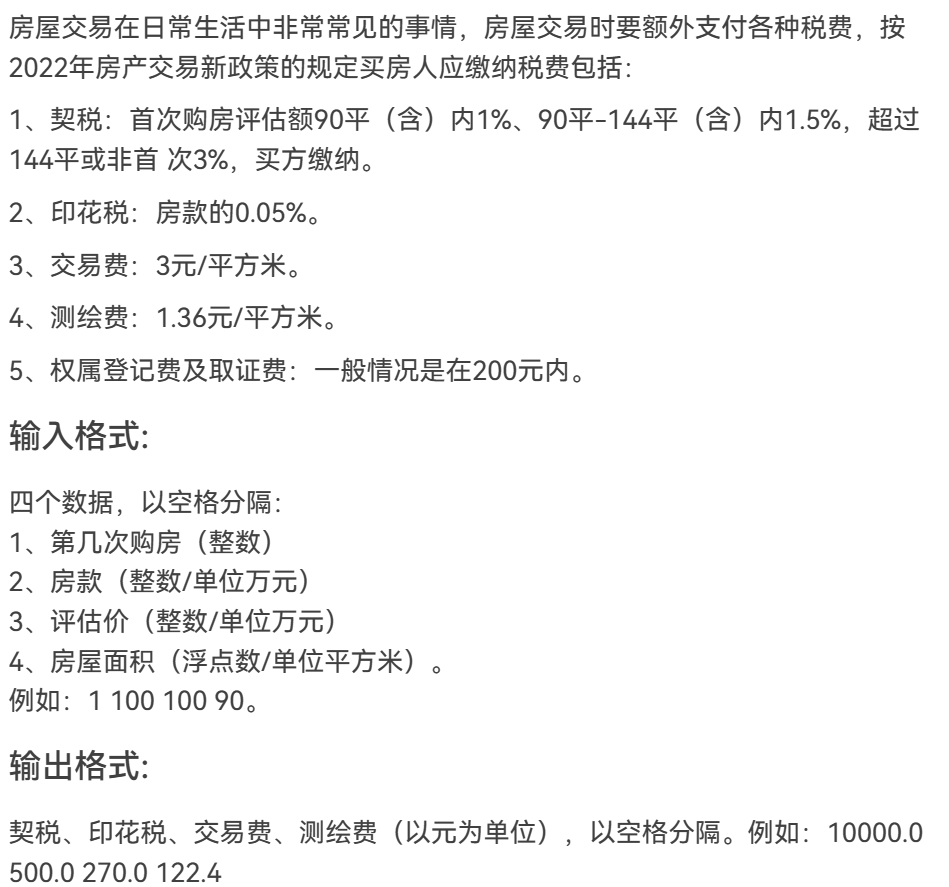 本题运用if判断语句对是否为首次购房和是否超过144平方米进行判断计算出不同情况对应的契税和其他税款。