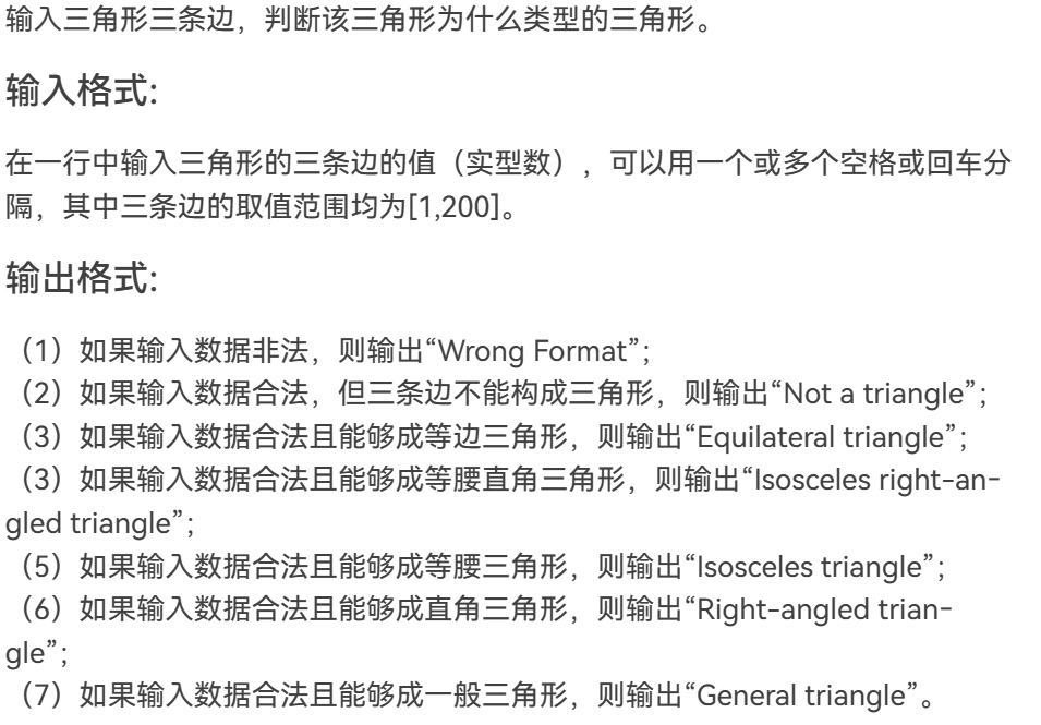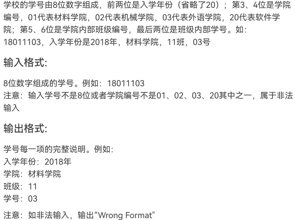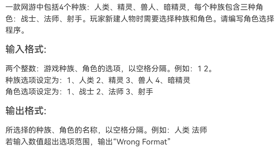 本题运用if判断语句对输入数值是否在选项范围内进行判断,若不在范围内输出“Wrong Format”,再运用switch语句对不同的输入情况有不同的输出结果。