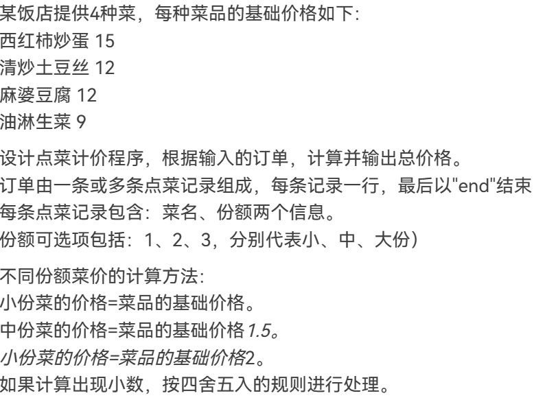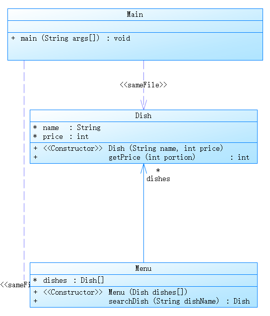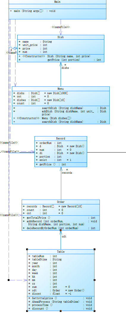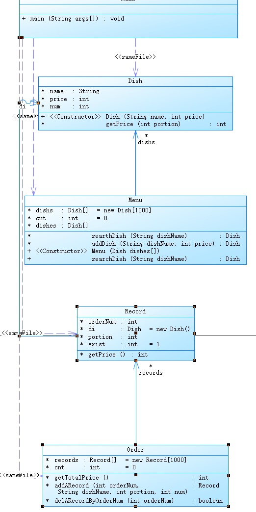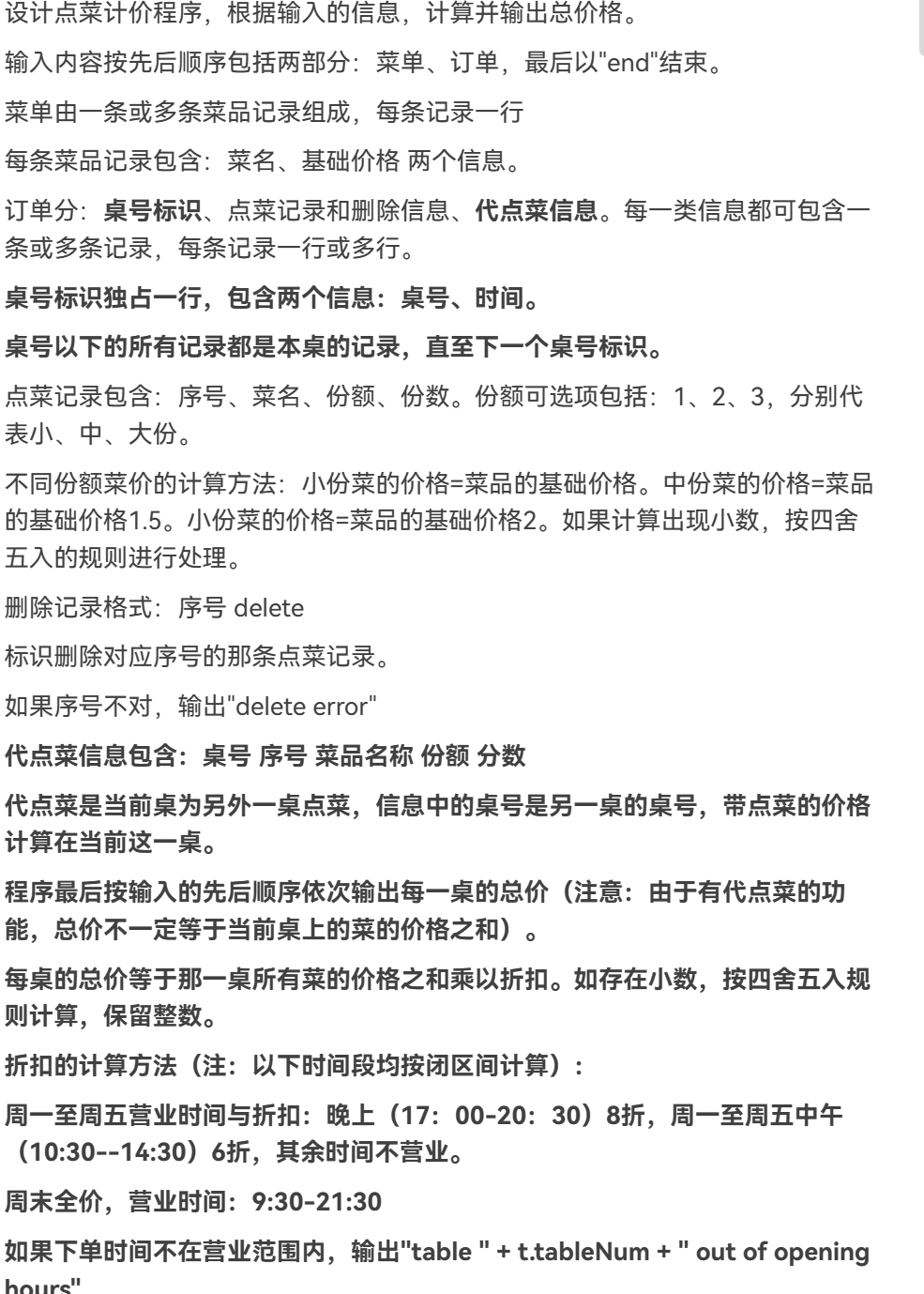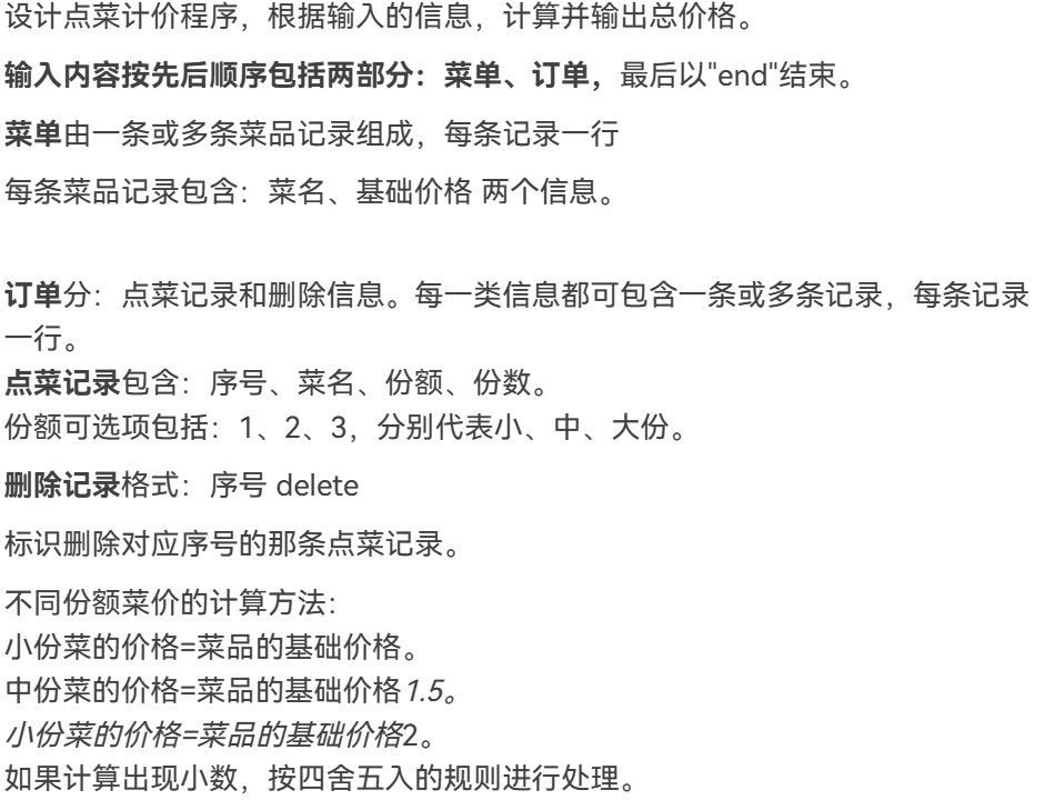 本题不仅要处理时间,也要处理桌号,很麻烦,存储数据的时候很容易出现纰漏。根据迭代前几次的经验,我在代码中定义了几个类,分别是:Dish(菜品),Menu(菜单),Record(订单记录),Order(订单),Table(餐桌)。在Main类中。循环中读取输入,根据输入的不同格式进行不同的操作,例如添加菜品到菜单,为指定餐桌添加订单,删除订单记录,代点菜等。最后,在循环结束后计算每个餐桌的总价。