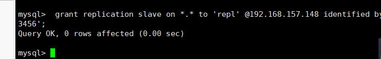 > grant replication slave on *.* to 'repl' @192.168.157.148 identified by '123456';