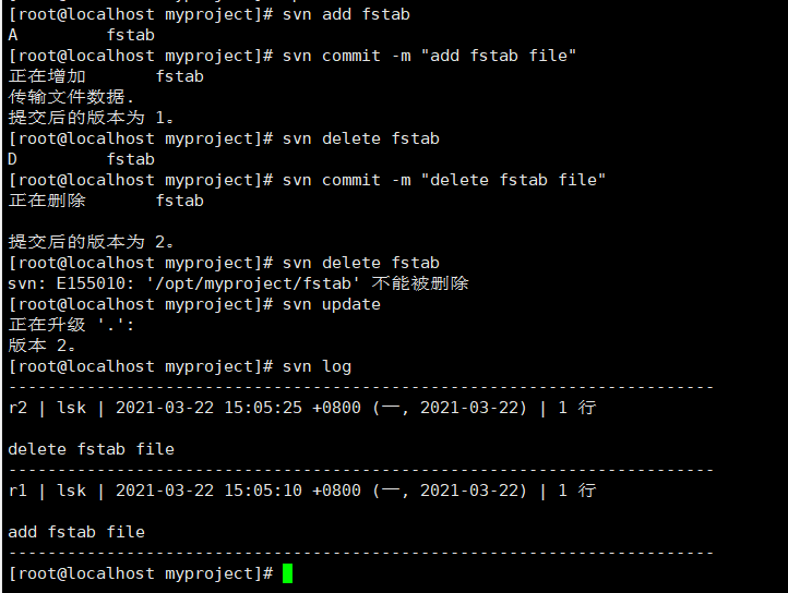 #svn commit -m "delete fstab file" //在服务器上提交删除操作