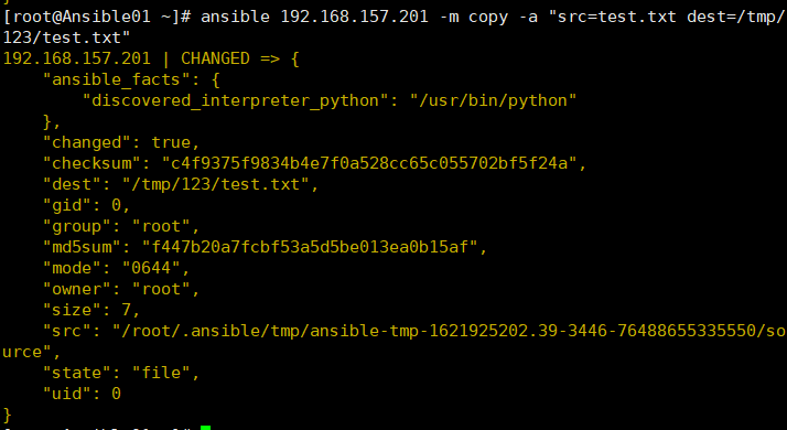 ansible 192.168.157.201 -m copy -a "src=test.txt dest=/tmp/123/test.txt"