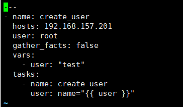 ·说明: name参数对该playbook实现的功能做一个概述,后面执行过程中,会打印name变量的值,可以省略; gather_facts参数指定了在以下任务部分执行前,是否先执行setup模块获取主机相关信息,这在后面的task会使用到setup获取的信息时用到; vars参数,指定了变量,这里指字一个user变量,其值为test,需要注意的是,变量值一定要用引号引住;user提定了调用user模块,name是user模块里的一个参数,而增加的用户名字调用了上面user变量的值。