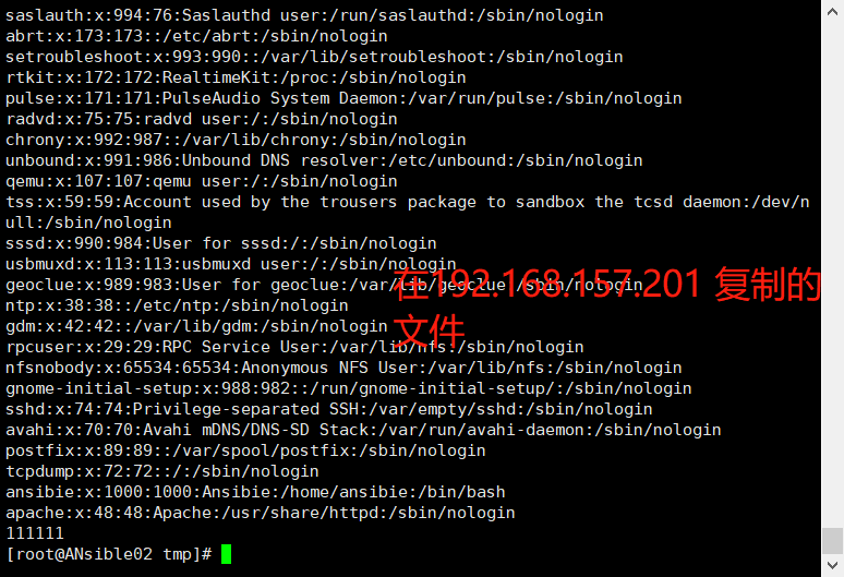 ②、如果拷贝的是文件 :ansible 192.168.157.201 -m copy -a "src=test1.txt dest=/tmp/test2.txt"