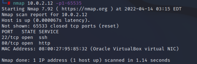 端口扫描:nmap 10.0.2.12 -p1-65535