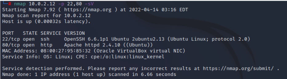 服务版本扫描:nmap 10.0.2.12 -p 22,80 -sV