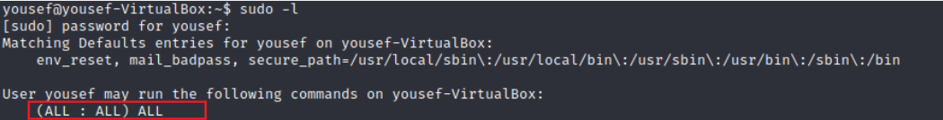 查看其用户的sudo权限,结果显示拥有全部的sudo权限