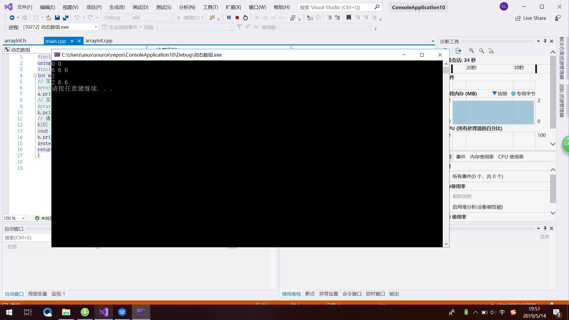 include <iostream> using namespace std; #include "arrayInt.h" int main() { // 定义动态整型数组对象a,包含2个元素,初始值为0 ArrayInt a(2); a.print(); // 定义动态整型数组对象b,包含3个元素,初始值为6 ArrayInt b(3, 6); b.print(); // 通过对象名和下标方式访问并修改对象元素 b[0] = 2; cout << b[0] << endl; b.print(); system("pause"); return 0; }