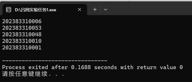 #include <stdio.h> #include <stdlib.h> #include <time.h> #define N 5 int main() { int number; int i; srand( time(0) ); for(i = 0; i < N; ++i) { number = rand()%65 + 1; printf("20238331%04d\n", number); } return0; }