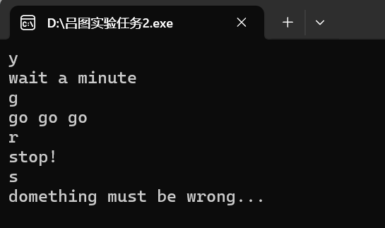 #include<stdio.h> #include<stdlib.h> int main(){ char color; while(1){ scanf("%c",&color); switch(color){ case 'r':printf("stop!\n");break; case 'g':printf("go go go\n");break; case 'y':printf("wait a minute\n");break; default:printf("domething must be wrong...\n");break; } getchar(); } return 0; }