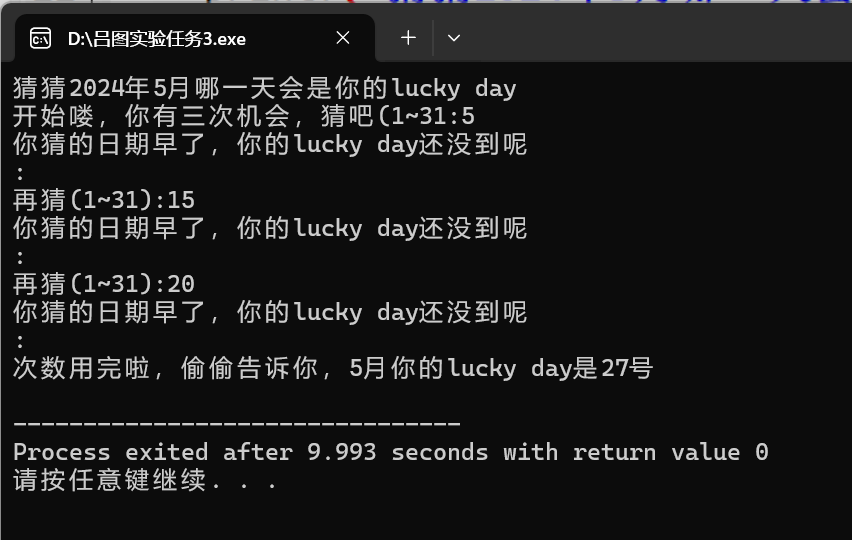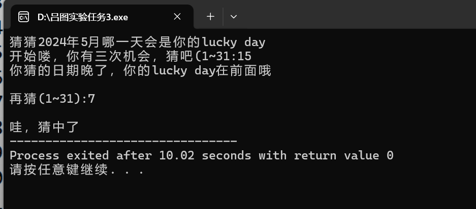 #include<stdio.h> #include<stdlib.h> #include<time.h> int main(){ int ld, d; int i; srand( time(0)); ld = rand()%31 + 1; printf("猜猜2024年5月哪一天会是你的lucky day\n开始喽,你有三次机会,猜吧(1~31:"); for(i = 1;i <= 3;i++){ scanf("%d",&d); if(d < ld){ printf("你猜的日期早了,你的lucky day还没到呢\n:"); if(i <= 2){ printf("\n再猜(1~31):"); } } if(d > ld){ printf("你猜的日期晚了,你的lucky day在前面哦\n"); if(i <= 2){ printf("\n再猜(1~31):"); } } if(d == ld){ printf("\n哇,猜中了"); return 0; } } if(d != ld) printf("\n次数用完啦,偷偷告诉你,5月你的lucky day是%d号\n",ld); return 0; }