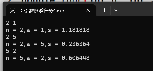 #include<stdio.h> double func(int n, int a); int main() { int n, a; double s; while(1){ scanf("%d%d",&n,&a); s=func(n,a); printf("n = %d,a = %d,s = %lf\n",n,a,s); } return 0; } double func(int n, int a) { int i,b=0; double s=0.0; for(i=1;i<=n;i++){ b=b*10+a; s=s+1.0*i/b; } return s; }
