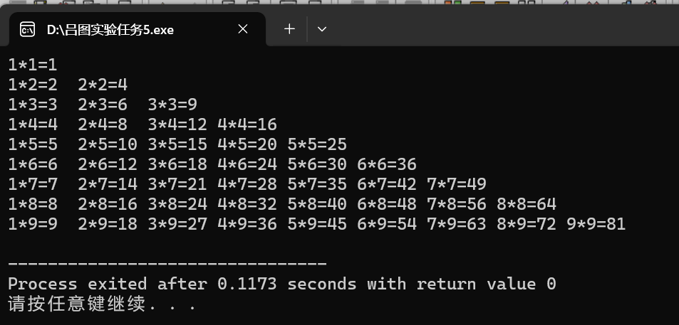 #include<stdio.h> int main(){ int i,j; for(i=1;i<=9;i++){ for(j=1;j<=i;j++){ printf("%d*%d=%-3d",j,i,j*i); } printf("\n"); } return 0; }