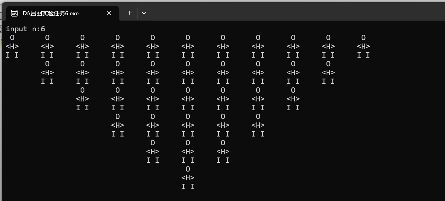 #include <stdio.h> int main() { int n, i, k, j; printf("input n:"); scanf ("%d", &n); for (i=0;i<n;i++) { for (j=0;j<i; j++){ printf("\t") ; } for (k=2*(n-i)-1;k>0;k--) { printf(" O \t"); } printf("\n"); for (j=0; j<i; j++) { printf("\t"); } for (k=2*(n-i)-1;k>0;k--) { printf("<H>\t"); } printf("\n"); for (j=0; j<i; j++) { printf("\t"); } for (k=2*(n-i)-1;k>0;k--) { printf("I I\t"); } printf("\n"); } return 0; }
