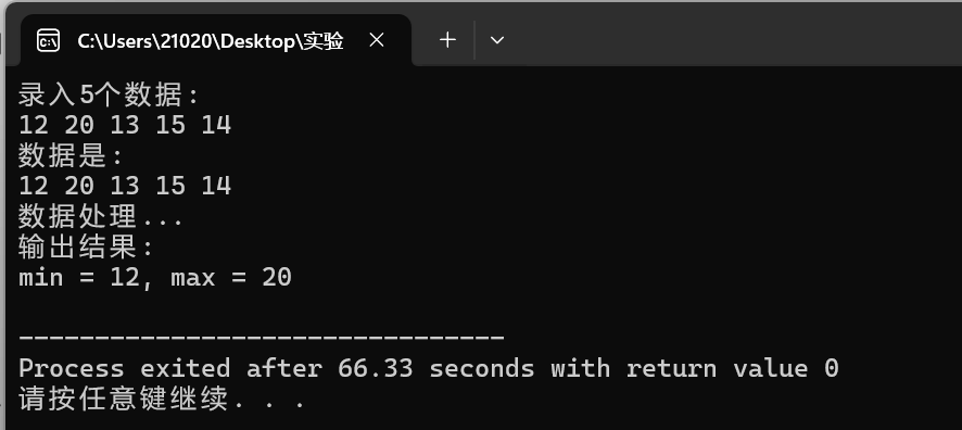 #include <stdio.h> #define N 5 void input(int x[], int n); void output(int x[], int n); void find_min_max(int x[], int n, int *pmin, int *pmax); int main() { int a[N]; int min, max; printf("录入%d个数据:\n", N); input(a, N); printf("数据是: \n"); output(a, N); printf("数据处理...\n"); find_min_max(a, N, &min, &max); printf("输出结果:\n"); printf("min = %d, max = %d\n", min, max); return 0; } void input(int x[], int n) { int i;