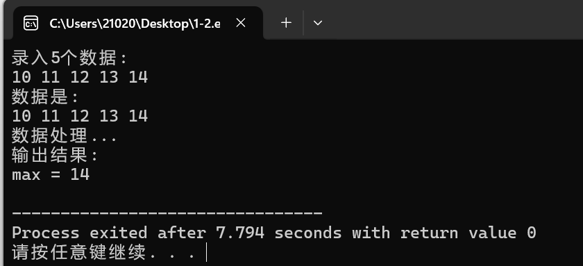 #include <stdio.h> #define N 5 void input(int x[], int n); void output(int x[], int n); int *find_max(int x[], int n); int main() { int a[N]; int *pmax; printf("录入%d个数据:\n", N); input(a, N); printf("数据是: \n"); output(a, N); printf("数据处理...\n"); pmax = find_max(a, N); printf("输出结果:\n"); printf("max = %d\n", *pmax); return 0; } void input(int x[], int n) { int i; for(i = 0; i < n; ++i) scanf("%d", &x[i]); } void output(int x[], int n) { int i; for(i = 0; i < n; ++i) printf("%d ", x[i]); printf("\n"); } int *find_max(int x[], int n) { int max_index = 0; int i; for(i = 1; i < n; ++i) if(x[i] > x[max_index]) max_index = i; return &x[max_index]; }