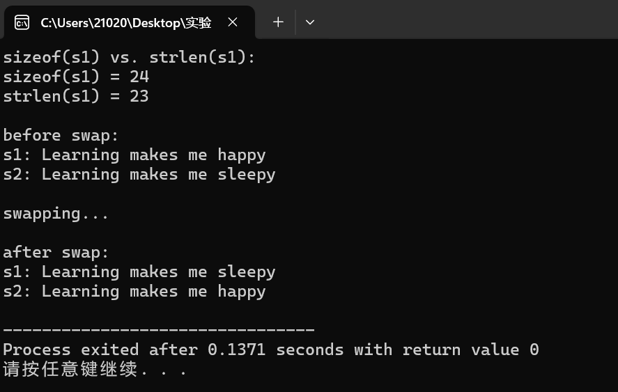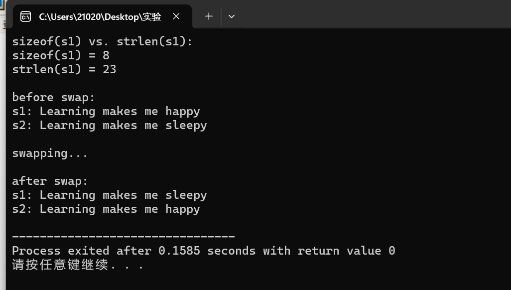 #include <stdio.h> #include <string.h> #define N 80 int main() { char *s1 = "Learning makes me happy"; char *s2 = "Learning makes me sleepy"; char *tmp; printf("sizeof(s1) vs. strlen(s1): \n"); printf("sizeof(s1) = %d\n", sizeof(s1)); printf("strlen(s1) = %d\n", strlen(s1)); printf("\nbefore swap: \n"); printf("s1: %s\n", s1); printf("s2: %s\n", s2); printf("\nswapping...\n"); tmp = s1; s1 = s2; s2 = tmp; printf("\nafter swap: \n"); printf("s1: %s\n", s1); printf("s2: %s\n", s2); return 0; }