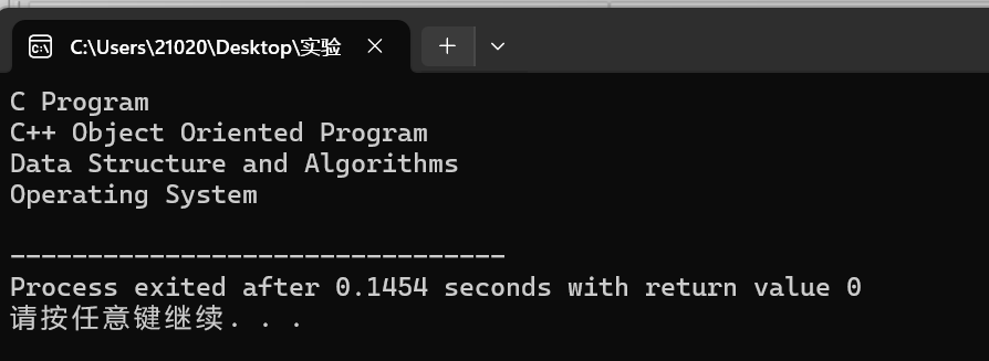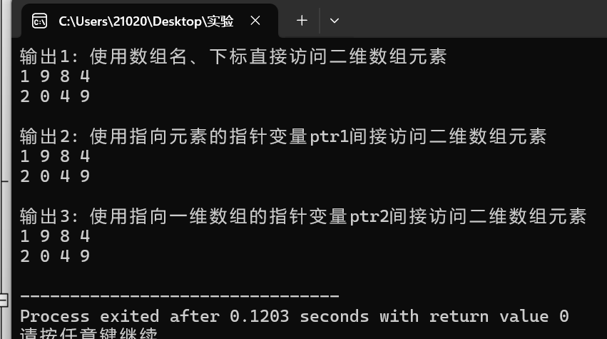 #include <stdio.h> #include <stdio.h> int main() { int x[2][4] = {{1, 9, 8, 4}, {2, 0, 4, 9}}; int i, j; int *ptr1; // 指针变量,存放int类型数据的地址 int(*ptr2)[4]; // 指针变量,指向包含4个int元素的一维数组 printf("输出1: 使用数组名、下标直接访问二维数组元素\n"); for (i = 0; i < 2; ++i) { for (j = 0; j < 4; ++j) printf("%d ", x[i][j]); printf("\n"); } printf("\n输出2: 使用指向元素的指针变量ptr1间接访问二维数组元素\n"); for (ptr1 = &x[0][0], i = 0; ptr1 < &x[0][0] + 8; ++ptr1, ++i) { printf("%d ", *ptr1); if ((i + 1) % 4 == 0) printf("\n"); } printf("\n输出3: 使用指向一维数组的指针变量ptr2间接访问二维数组元素\n"); for (ptr2 = x; ptr2 < x + 2; ++ptr2) { for (j = 0; j < 4; ++j) printf("%d ", *(*ptr2 + j)); printf("\n"); } return 0; }