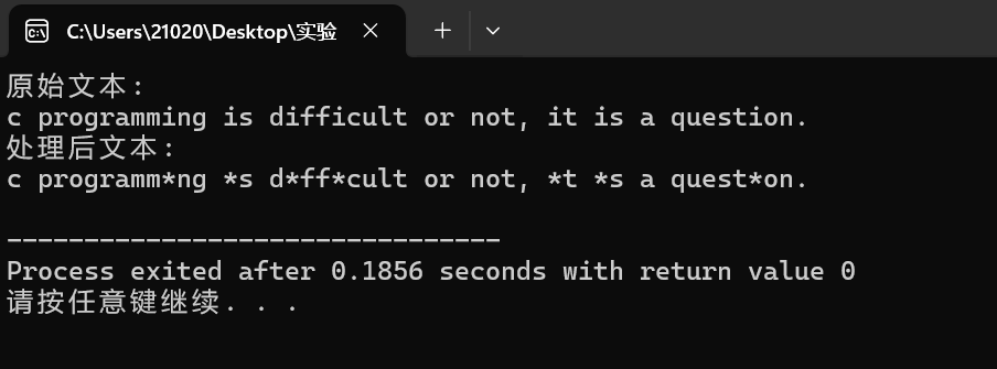 #include <stdio.h> #define N 80 void replace(char *str, char old_char, char new_char); // 函数声明 int main() { char text[N] = "c programming is difficult or not, it is a question."; printf("原始文本: \n"); printf("%s\n", text); replace(text, 'i', '*'); // 函数调用 注意字符形参写法,单引号不能少 printf("处理后文本: \n"); printf("%s\n", text); return 0; } // 函数定义
