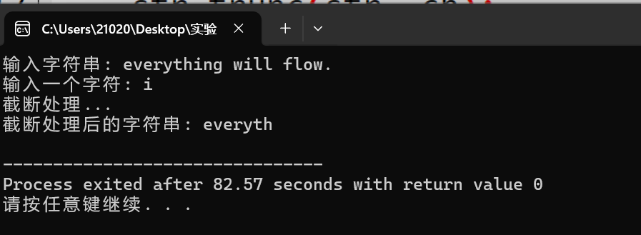 #include <stdio.h> #define N 80 void str_trunc(char* str, char x); int main() { char str[N]; char ch; printf("输入字符串: "); gets(str); printf("输入一个字符: "); ch = getchar(); printf("截断处理...\n"); str_trunc(str, ch); printf("截断处理后的字符串: %s\n", str); return 0; } void str_trunc(char* str, char x) { while (*str) { if (*str == x) *str = '\0'; // blank1 str++; // blank2 } }