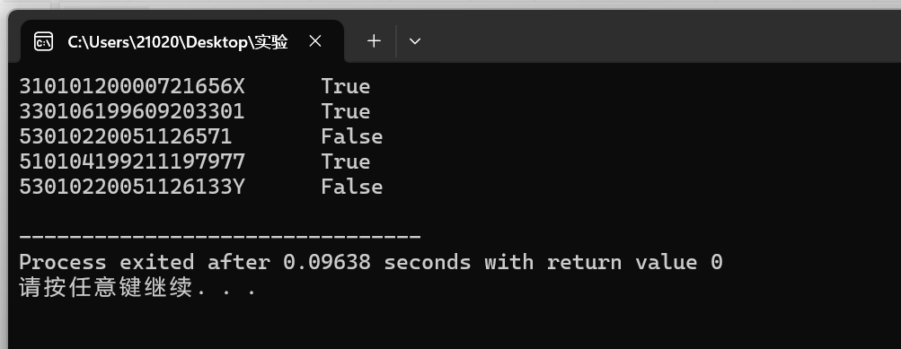 #include <stdio.h> #include <string.h> #define N 5 int check_id(char* str); // 函数声明 int main() { char* pid[N] = { "31010120000721656X", "330106199609203301", "53010220051126571", "510104199211197977", "53010220051126133Y" }; int i; for (i = 0; i < N; ++i) if (check_id(pid[i])) // 函数调用 printf("%s\tTrue\n", pid[i]); else printf("%s\tFalse\n", pid[i]); return 0; } // 函数定义 // 功能: 检查指针str指向的身份证号码串形式上是否合法。 // 形式合法,返回1,否则,返回0 int check_id(char* str) { // 补足函数实现 // ... if (strlen(str) == 18) { while (*str) { if (!((*str <= 58 && *str >= 47) || (*str == 'X'))) return 0; str++; } return 1; } else return 0; }