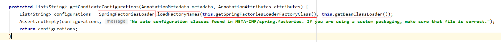 List<String> configurations = SpringFactoriesLoader.loadFactoryNames(this.getSpringFactoriesLoaderFactoryClass(), this.getBeanClassLoader());