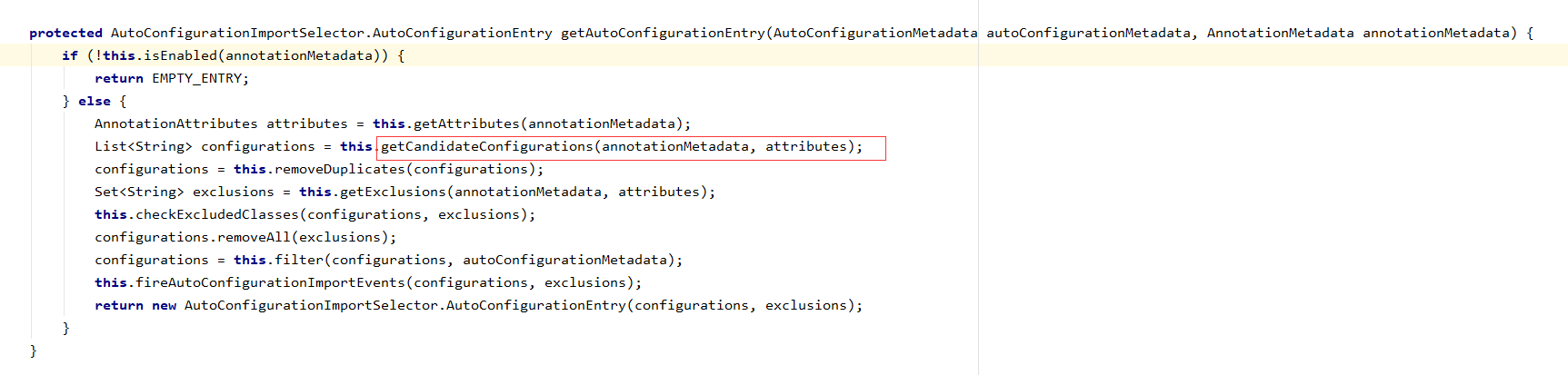 AutoConfigurationImportSelector.AutoConfigurationEntry autoConfigurationEntry = this.getAutoConfigurationEntry(autoConfigurationMetadata, annotationMetadata);