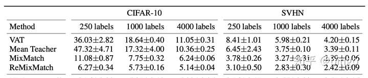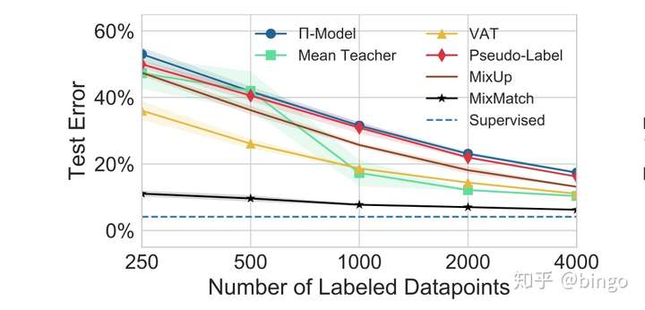 图2. CIFAR10错误率随着有标签数据变化图。可以看出,MixMatch的错误率明显低于对比方法。