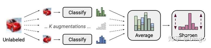 图1. 标签猜测和锐化过程。首先,将K个数据增强样本的预测结果进行平均,然后通过调整分布的"温度"进行锐化。