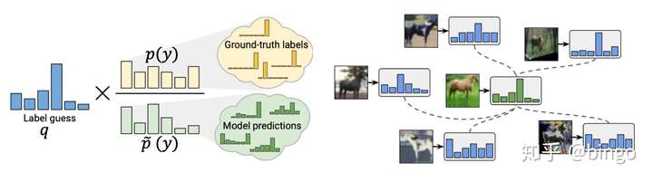 图3. (左):Distribution Alignment,将无标签数据的预测分布和有标签数据对齐;(右):Augmentation Anchor,使用弱增强样本(绿)的预测结果,作为强增强样本(蓝)的训练目标。