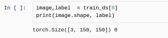 这意味着图像的大小为 150 * 150,具有三个通道,其标签为 0。