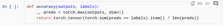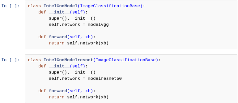 class ImageClassificationBase(nn.Module): def training_step(self, batch): images, labels = batch out = self(images) # Generate predictions loss = F.cross_entropy(out, labels) # Calculate loss return loss def validation_step(self, batch): images, labels = batch out = self(images) # Generate predictions loss = F.cross_entropy(out, labels) # Calculate loss acc = accuracy(out, labels) # Calculate accuracy return {'val_loss': loss.detach(), 'val_acc': acc} def validation_epoch_end(self, outputs): batch_losses = [x['val_loss'] for x in outputs] epoch_loss = torch.stack(batch_losses).mean() # Combine losses batch_accs = [x['val_acc'] for x in outputs] epoch_acc = torch.stack(batch_accs).mean() # Combine accuracies return {'val_loss': epoch_loss.item(), 'val_acc': epoch_acc.item()} def epoch_end(self, epoch, result): print("Epoch [{}], train_loss: {:.4f}, val_loss: {:.4f}, val_acc: {:.4f}".format( epoch, result['train_loss'], result['val_loss'], result['val_acc']))