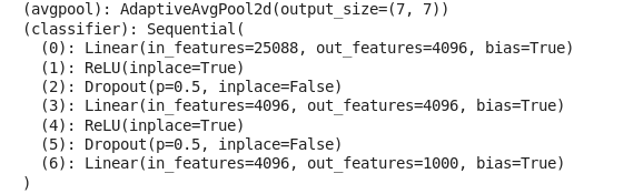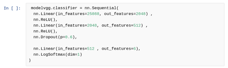 我已经用我自己的分类器层替换了分类器层,因为我们可以看到有 6 个 out_features,这意味着 6 个输出,但在预训练模型中还有一些其他的数字,因为模型经过训练,可以对这些数量的类进行分类。
