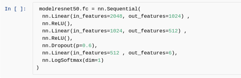 请注意,第一个线性层 层中的 in_features 与 2048 相同,而最后一个 线性层层中的 out_features 为 6。除了上面提到的,其他任何 in_features 和 out_features 都可以根据我们的选择进行更改。