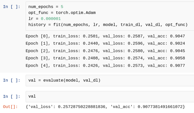 num_epochs = 10 opt_func = torch.optim.Adam lr = 0.00001 history = fit(num_epochs, lr, model, train_dl, val_dl, opt_func) Epoch [0], train_loss: 0.8719, val_loss: 0.3769, val_acc: 0.8793 Epoch [1], train_loss: 0.4265, val_loss: 0.3104, val_acc: 0.8942 Epoch [2], train_loss: 0.3682, val_loss: 0.2884, val_acc: 0.9016 Epoch [3], train_loss: 0.3354, val_loss: 0.2819, val_acc: 0.8988 Epoch [4], train_loss: 0.3205, val_loss: 0.2704, val_acc: 0.9033 Epoch [5], train_loss: 0.2977, val_loss: 0.2722, val_acc: 0.9021 Epoch [6], train_loss: 0.2853, val_loss: 0.2629, val_acc: 0.9068 Epoch [7], train_loss: 0.2784, val_loss: 0.2625, val_acc: 0.9045 Epoch [8], train_loss: 0.2697, val_loss: 0.2623, val_acc: 0.9033 Epoch [9], train_loss: 0.2530, val_loss: 0.2629, val_acc: 0.9018
