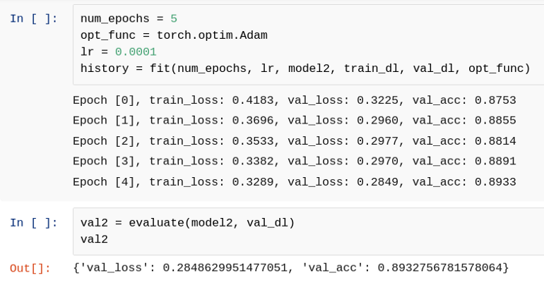 num_epochs = 5 opt_func = torch.optim.Adam lr = 0.0001 history = fit(num_epochs, lr, model2, train_dl, val_dl, opt_func) Epoch [0], train_loss: 0.4183, val_loss: 0.3225, val_acc: 0.8753 Epoch [1], train_loss: 0.3696, val_loss: 0.2960, val_acc: 0.8855 Epoch [2], train_loss: 0.3533, val_loss: 0.2977, val_acc: 0.8814 Epoch [3], train_loss: 0.3382, val_loss: 0.2970, val_acc: 0.8891 Epoch [4], train_loss: 0.3289, val_loss: 0.2849, val_acc: 0.8933