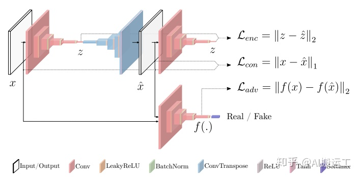 正常来说,采用第一个子网络的生成损失和第三个子网络的判别损失就能生成比较不错的图片了,但是这篇文章主要解决的是异常检测问题。异常是图片集的特性,采用像素级的损失(原图和重建图的差异)来推断是不够合理的,因而引入了第二个子网络的编码损失,文章中最后用于推断的也是该损失。