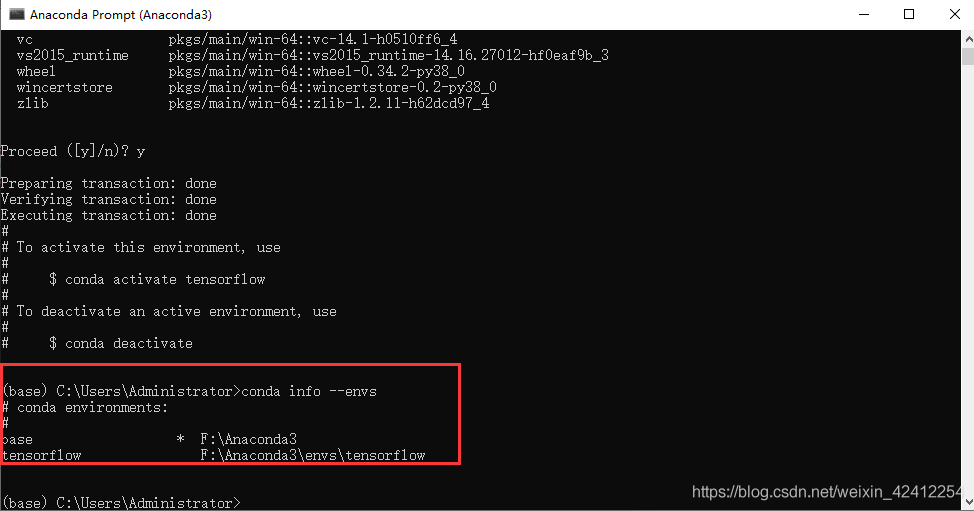如果不幸下载失败,再次键入(不用担心在下载失败之前建立过一个名为tensorflow的环境,是否会出现重名错误。实际上的处理步骤是:检查环境中是否有tensorflow环境,没有的话创建,有的话检索所需的库,自动下载缺失的库,上一次下载失败的库,会在这一次重新下载)