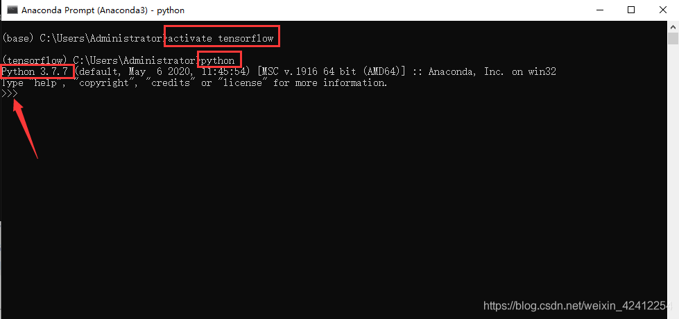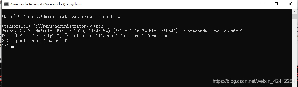注意到,在切换到tensorflow环境时命令行前方变为了(tensorflow),说明我们成功启动了tensorflow环境,再输入python后,最前方变为>>>,意味着我们进入了tensorflow的python环境中(并且是python3.7环境)