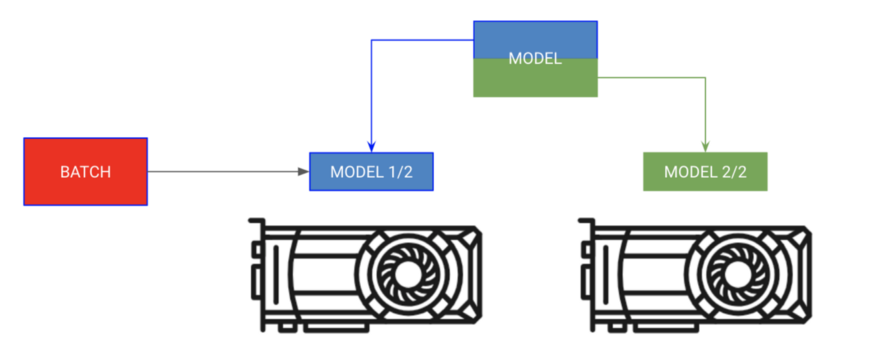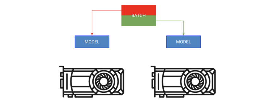 第一种方法被称为“分batch训练”。该策略将模型复制到每个GPU上,每个GPU获得batch的一部分。