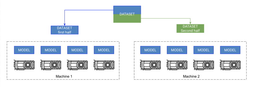 每台机器上的每个GPU都有一个模型的副本。每台机器获得数据的一部分,并且只在那部分上训练。每台机器都能同步梯度。